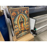 Encadrée par des roses somptueuses aux nuances dorées et ivoire, chaque détail de cette œuvre évoque la pureté, l’amour et le lien sacré entre le ciel et la terre. Les anges délicatement peints, le croissant de lune et les motifs floraux accentuent la majesté de cette représentation intemporelle. À ses pieds, une bannière portant l’inscription “La Virgen de Guadalupe” souligne son rôle de protectrice et de guide spirituel.