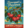 Des cerises rouges et brillantes suspendues à leur branche sous le ciel bleu de Provence. Une affiche rétro gourmande et lumineuse.