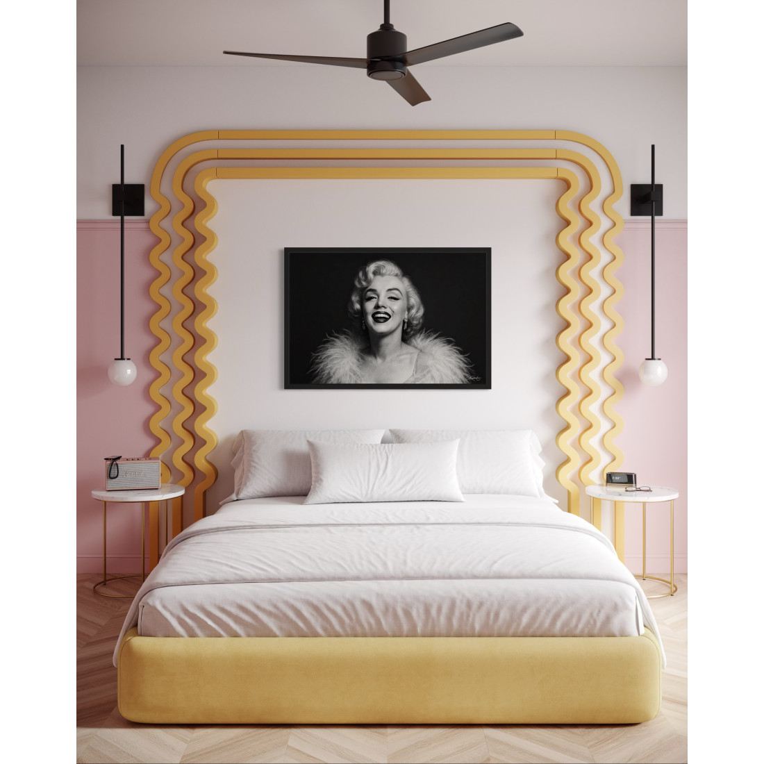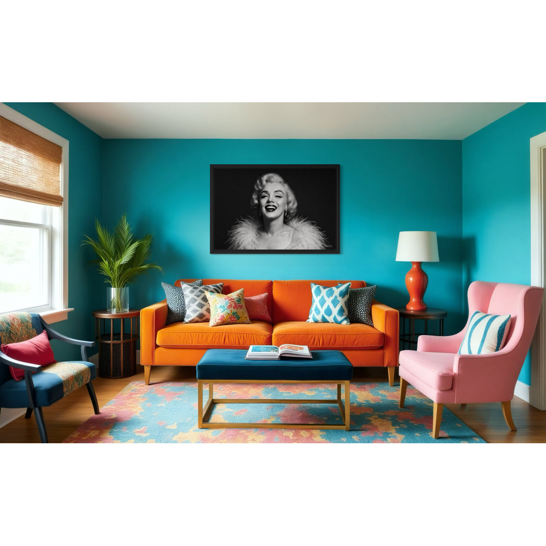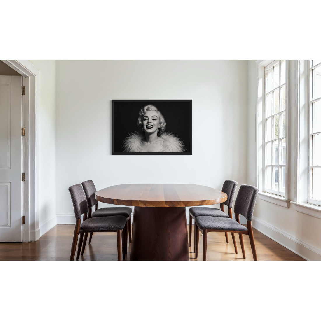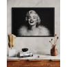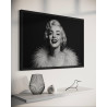 Un portrait lumineux de Marilyn Monroe, capturée dans un éclat de rire, drapée d’un somptueux boa. Une icône intemporelle du cinéma sublimée en noir et blanc.