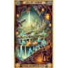 L’illustration met en scène un monde fantastique rempli de cristaux géants, baignés de lumières éclatantes, et peuplé de créatures préhistoriques telles que des dinosaures. Les explorateurs, équipés de lampes à huile, avancent sur un sentier escarpé, entourés de cascades majestueuses et de ponts naturels suspendus. Chaque détail, des stalactites scintillantes aux nuances profondes et lumineuses, raconte une histoire de découverte, de mystère et de courage.