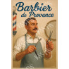 Affiche vintage d’un barbier provençal. Un hommage élégant au savoir-faire, à l’élégance et à l’ambiance chaleureuse des salons d’autrefois.