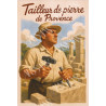 Illustrée dans un style fidèle aux affiches publicitaires des années 40-50, cette création saisit la force tranquille du tailleur de pierre, artisan de l’ombre, poète du minéral. Une scène qui respire la Provence, le savoir-faire et le temps long.