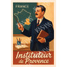 Le personnage, élégant dans son costume bleu marine et sa cravate rayée, tient d’une main un livre et de l’autre une baguette, pointée vers la carte de France dessinée à la craie. Son regard concentré, mais bienveillant, illustre le sérieux d’une époque où la géographie était un outil de découverte du monde et d’attachement au territoire.