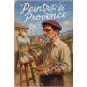 Le personnage, concentré et serein, tient d’une main une palette colorée et de l’autre un pinceau suspendu dans l’instant de la décision. Vêtu d’une chemise en lin et coiffé d’un béret bordeaux, il se tient face à son chevalet, capturant les toits ocre, les cyprès dressés, et le clocher d’un village provençal. Derrière lui, les collines s’étendent paisiblement sous un ciel d’azur, suggérant la lente respiration de la campagne.