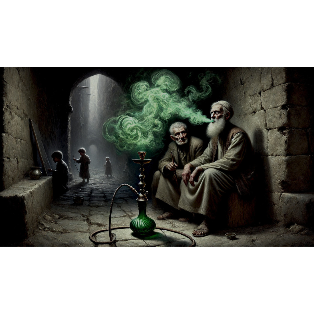 Adossés au mur chaud d’une ruelle oubliée, deux hommes aux visages burinés laissent échapper de lentes volutes de fumée, comme autant de pensées silencieuses qui montent vers un ciel absent. Le narguilé crépite doucement à leurs pieds, rythme discret d’un moment sans hâte. Leurs regards, posés sur le vide ou peut-être sur l’intérieur d’eux-mêmes, traduisent une paix ancienne, un savoir qu’on ne transmet plus par les mots.