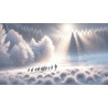 Au centre de cette clarté naissante, une silhouette encapuchonnée avance lentement, entourée d’un petit troupeau de cervidés. Ensemble, ils tracent un chemin discret dans la blancheur du matin, sans troubler la paix du paysage. Derrière eux, la forêt s’éveille peu à peu, baignée de rayons obliques qui transforment la scène en vision presque mystique.