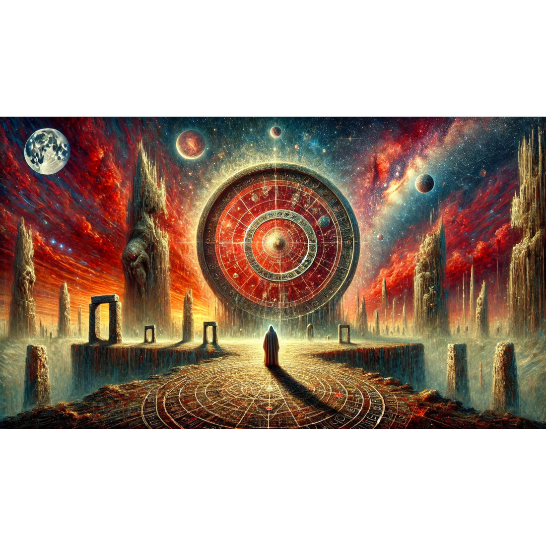 Il se tient seul, drapé de silence, au centre d’un cercle gravé de lignes oubliées. Devant lui, suspendue dans l’éther brûlant d’un ciel de flammes et d’étoiles, s’élève la Roue des Mondes — une structure immense, tournée vers l’infini, comme si l’univers lui-même y avait inscrit son secret.