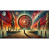 Chaque anneau, chaque symbole semble vibrer d’un sens ancien, d’un ordre que seuls les initiés peuvent entrevoir. Autour, les colonnes s’élancent comme les vestiges d’une civilisation disparue, ou les doigts pétrifiés de dieux en sommeil. Le sol, pavé de constellations, de portes, de chiffres et d’ombres, trace les chemins possibles de ceux qui osent regarder au-delà du réel.