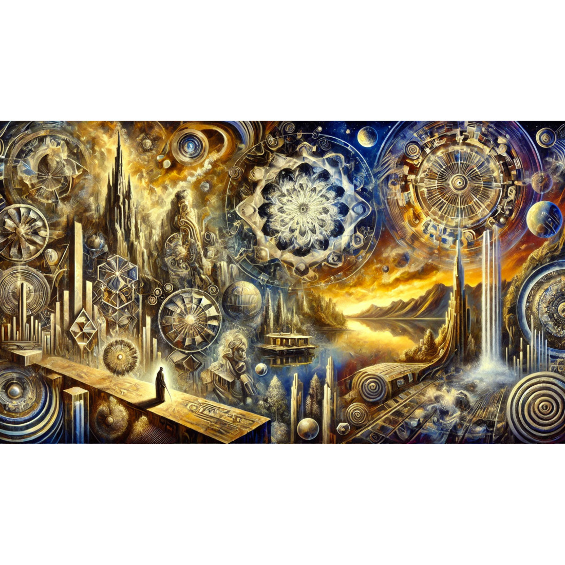 Caché au cœur d’un monde fait de géométries sacrées et d’architectures suspendues, Le Secret aux Robes de Lumière s’avance comme un songe figé dans l’or et le silence. Une silhouette solitaire chemine sur une passerelle d’or, entourée de mandalas mouvants, de rouages célestes, de figures énigmatiques. Tout autour d’elle, l’espace semble composé non de matière, mais de souvenirs, de souhaits tissés dans la lumière.