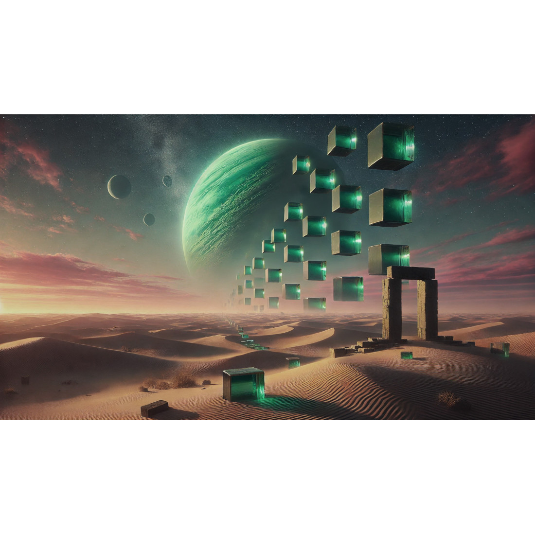 Dans l’immensité d’un désert figé par le silence, là où les dunes ondulent comme les pensées d’un monde oublié, s’élève une procession de formes parfaites. Des cubes lumineux, suspendus dans l’air, tracent une trajectoire invisible — un escalier sans marche, une voie céleste. On ne sait d’où ils viennent, ni où ils mènent, mais leur éclat vert, profond comme une gemme vivante, semble appeler ceux qui savent encore lever les yeux.