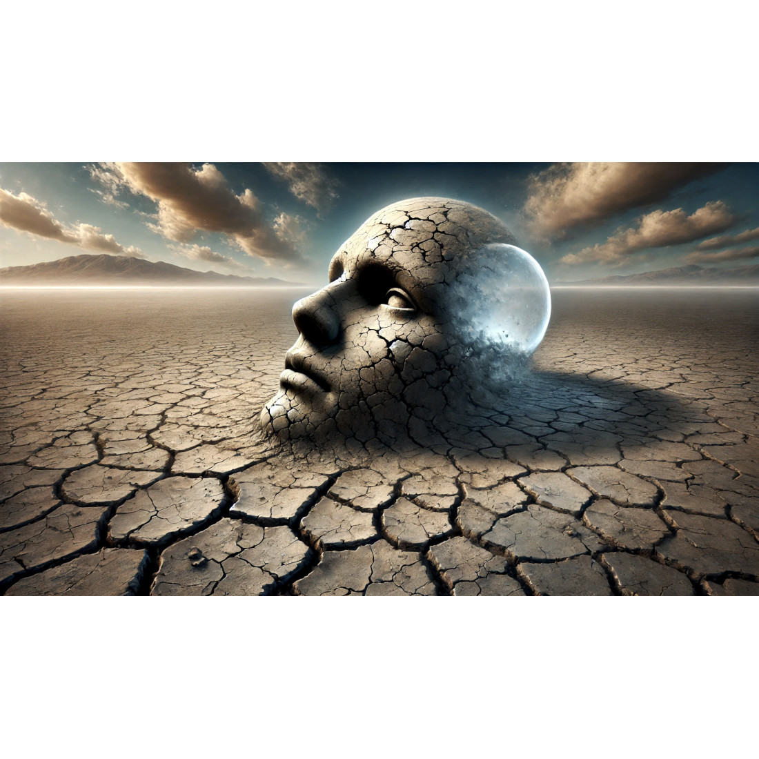 Sous un ciel pâle où dérivent de lentes nuées, la terre, fissurée par le temps, semble figée dans une attente séculaire. Le sol craquelé, stérile et silencieux, s'étend à perte de vue, comme la peau ancienne d'un monde qui aurait cessé de respirer. Et là, posé comme un vestige oublié par l’Histoire, un visage colossal repose, à demi enfoui, les yeux mi-clos, le front tourné vers les derniers vents du souvenir.