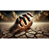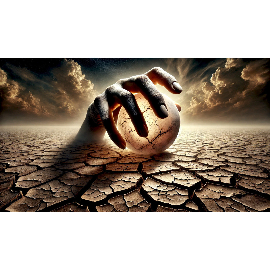 Dans une étendue de terre fendue par le feu du temps, le silence règne. Le sol, craquelé comme une peau trop longtemps exposée à l’oubli, s’étend à perte de vue. Et de ce désert minéral émerge une main. Immense, humaine, mais comme sculptée par les forces du monde souterrain. Elle ne surgit pas avec violence. Elle s’élève lentement, presque avec tendresse, refermant ses doigts autour d’une sphère pâle et fissurée, lumineuse comme un œuf ancien, fragile comme un monde en gestation.