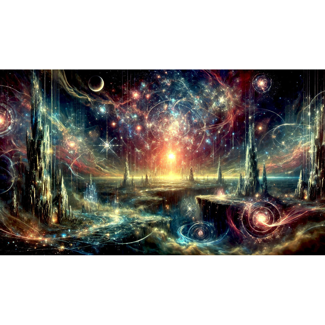 Tout semble flotter. Le ciel n’est plus ciel, mais un océan d’étoiles liquides et de nébuleuses vibrantes. D’immenses structures jaillissent du vide comme des flèches de cristal, scintillantes, irréelles, comme si une civilisation d’énergie pure avait élevé là ses cathédrales avant même que la matière n’ait une forme. Le sol, s’il en est un, est tissé de courants de lumière, de spirales, de rivières cosmiques en suspension.