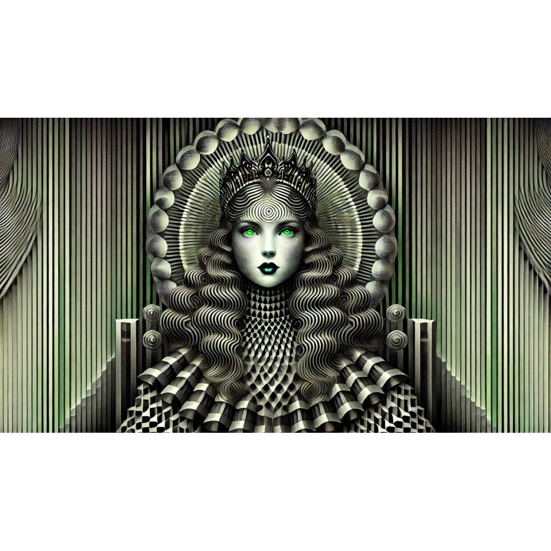 Elle siège au centre d’un monde fait de lignes, de vagues figées, de motifs infinis. Rien ne bouge, et pourtant tout semble vibrer. Les ondulations de ses cheveux se confondent avec celles de l’espace, comme si elle avait été tissée dans la matière même de la perception. Son regard, d’un vert hypnotique, transperce l’image sans jamais quitter son axe. Il ne cherche pas le spectateur : il voit au travers.