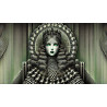 Autour d’elle, des colonnes rythmiques, des voiles sculptés de lumière, une géométrie sacrée. Le décor n’est ni palais ni cathédrale — c’est une structure mentale, un sanctuaire visuel dont elle serait à la fois gardienne et origine. Sa couronne ne brille pas : elle pulse. Elle impose silence, ordre, et fascination.