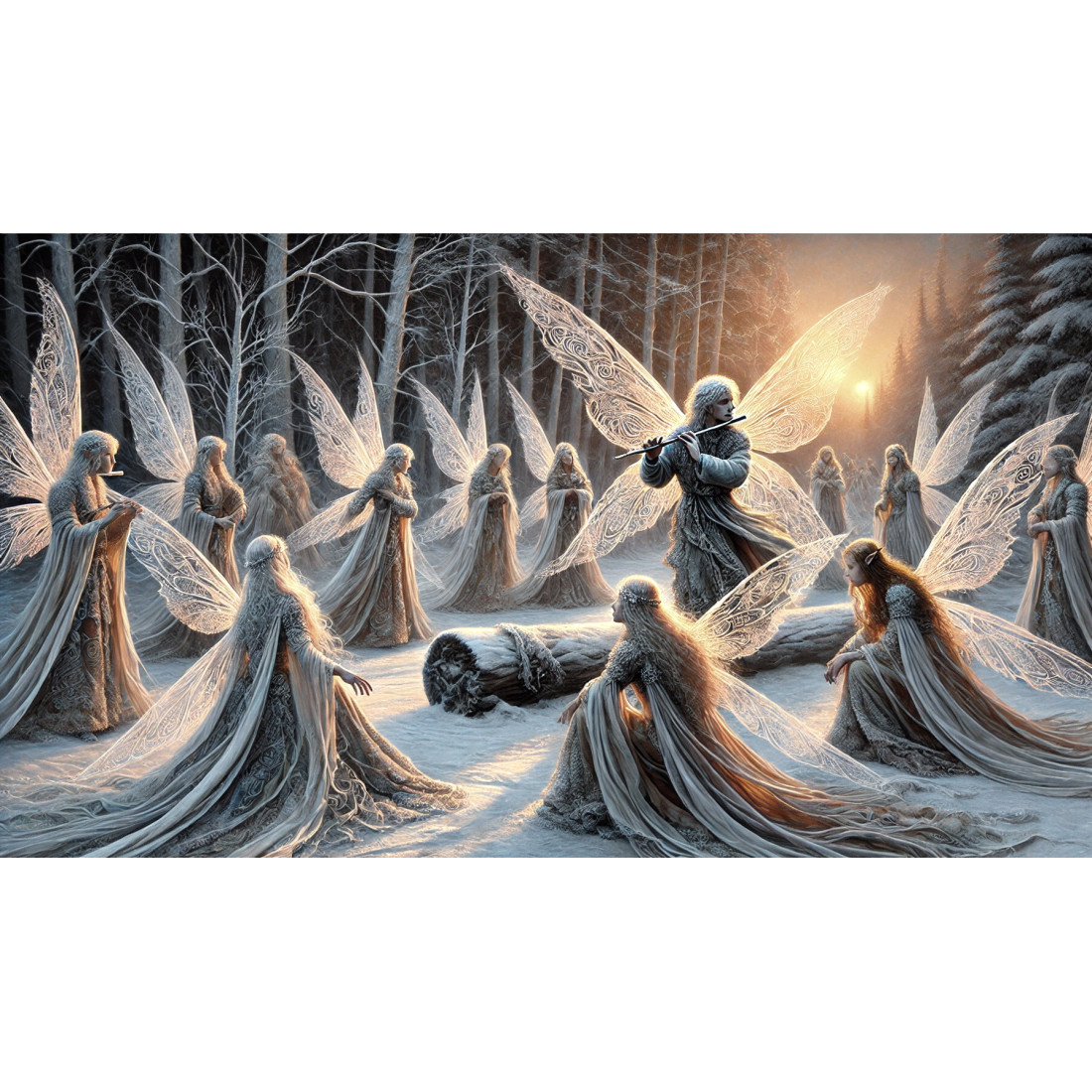 Sous les ramures figées d’une forêt blanche, quand l’air devient cristal et que le silence suspend la lumière, elles se rassemblent. Drapées de givre et d’ombres pâles, les fées hivernales forment un cercle autour d’une ancienne souche, marquée par le temps. Au centre, l’une d’elles souffle dans une flûte aux reflets d’opale, et le monde retient son souffle.