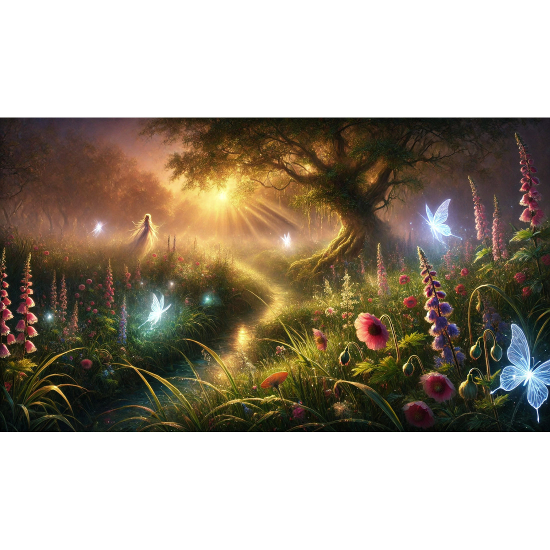 À la lisière d’un jardin baigné de lumière, fées et esprits veillent sur un passage entre les mondes. Une scène contemplative et pleine de mystère.