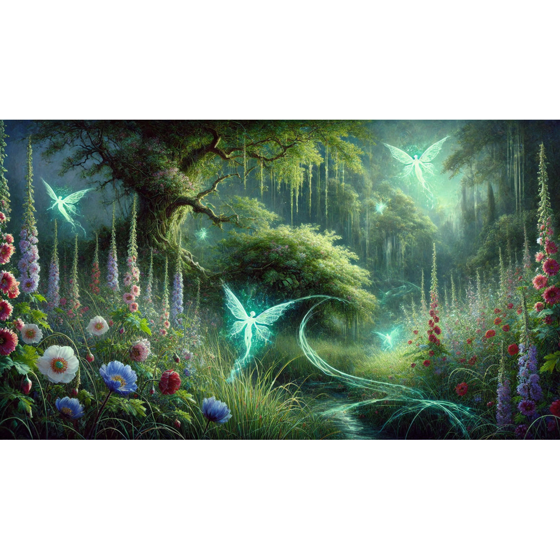 Les fées apparaissent telles des messagères du vivant, éthérées, vibrantes, comme faites d’une lumière aquatique. L’air lui-même semble traversé d’un souffle ancien, chargé de mémoire, d’enchantement et de renouveau. C’est le cœur battant du printemps caché, un sanctuaire émeraude où souffle encore l’écho des premiers chants du monde.
