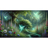 Dans l'épaisseur d'une clairière secrète, baignée d'une lumière vert-de-brume, les fées dansent comme des filaments d'énergie pure, traçant des arabesques lumineuses au-dessus d’un cours d’eau invisible. Le sanctuaire semble ancien, presque sacré — un lieu oublié du monde, où la nature conserve encore son pouvoir intact. Les arbres immenses, couverts de lianes pendantes, veillent silencieusement sur ce théâtre végétal où les hampes florales se dressent comme des cierges colorés. Chaque tige, chaque pétale, chaque reflet semble murmurer un secret ancien à qui sait écouter.