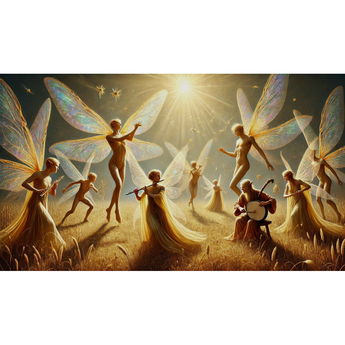 Un souffle chaud traverse les hautes herbes blondes, caressant les blés mûrs comme les cordes d’une harpe ancienne. Là, au milieu d’un océan doré vibrant de lumière, des êtres ailés venus d’un autre monde se livrent à une célébration lumineuse. Les fées, aux ailes irisées comme des vitraux vivants, virevoltent avec grâce, portées par les rythmes d’une musique ancestrale. Flûtes de bois, tambours de peau, harpes rustiques et chants cristallins composent une symphonie solaire.