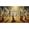 Chaque geste, chaque pas, chaque volute de robe évoque la gratitude envers la terre nourricière, dans une chorégraphie sacrée offerte à l’été. Certains dansent, légers comme le vent, d’autres jouent d’instruments en harmonie, assis sur des souches ou tournés vers le ciel. L’air est dense de grains flottants, de parfums mûrs et de poussière dorée. Cette scène suspendue entre mythe et lumière dépeint un instant de plénitude — un monde où la joie, la nature et le mystère ne font qu’un, sous la bénédiction éclatante du soleil.