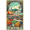 L’esthétique vintage de cette affiche, fidèle aux années 30, célèbre les traditions locales, tout en offrant une immersion visuelle dans un monde où la convivialité et le plaisir des sens règnent en maîtres. Le marché devient le théâtre animé des échanges entre producteurs, habitants et visiteurs, un moment figé dans le temps, empli de vie et de couleurs.
