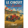 Nous sommes en 1947, au lendemain de la guerre, dans une France qui retrouve le goût du défi, de la fête et de la vitesse. Le Circuit des Sables incarne cette renaissance populaire et joyeuse : les spectateurs, massés derrière les drapeaux rouges, acclament le spectacle les yeux brillants. En toile de fond, un phare veille sur la scène comme un gardien immobile, tandis qu’un voilier glisse à l’horizon, contrepoint paisible à l’intensité de la course.