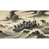 Sur un radeau frêle, des hommes traversent une mer agitée, unis dans le silence face à l’inconnu. Leurs gestes calmes, leur détermination muette, et la tension du ciel dessinent une scène entre méditation et épreuve. Une œuvre inspirée des estampes japonaises, qui célèbre le courage intérieur et la solidarité dans l’adversité.